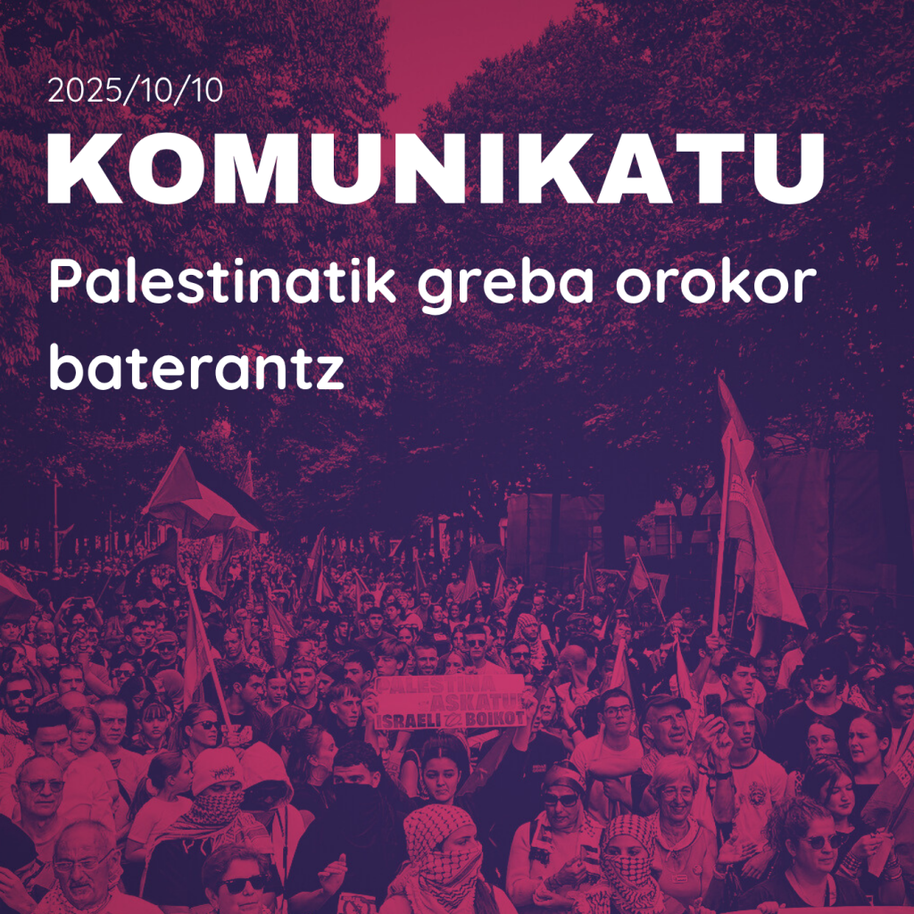 En este Aberri Eguna, desde el internacionalismo solidario, exigimos también el derecho del pueblo palestino a existir, a resistir y a liberarse de la ocupación y el genocidio. Reclamamos un compromiso real de todos los partidos vascos: romper relaciones comerciales y culturales con Israel, aplicar un embargo de armas y boicotear a todas las instituciones académicas y políticas que mantengan vínculos con el Estado sionista. ¡Desde el río hasta el mar, Palestina vencerá!