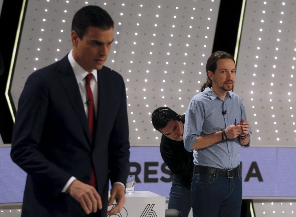 Podemos party leader Iglesias has his microphone adjusted by a technician as PSOE leader Sanchez stands before a live debate in San Sebastian de los Reyes